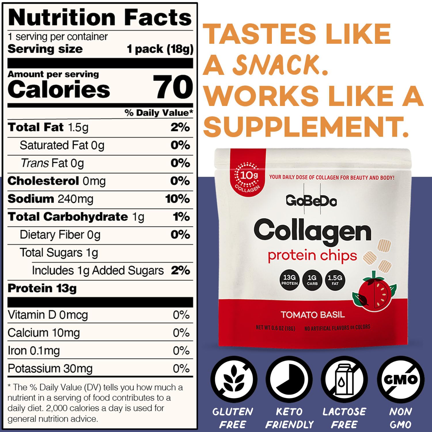 Fuel your day with GoBeDo Collagen Protein Chips, the world’s first patented collagen-based protein chips designed for clean eating and modern wellness. Each 18g bag delivers 13g of collagen protein—over 70% protein by weight—making it one of the highest-protein snacks per gram on the market.